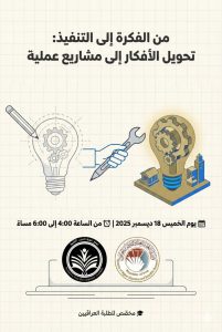 من الفكرة إلى التنفيذ: تحويل الأفكار إلى مشاريع عملية يوم الخميس 18 ديسمبر 2025 من الساعة 4:00 إلى 6:00 مساءً